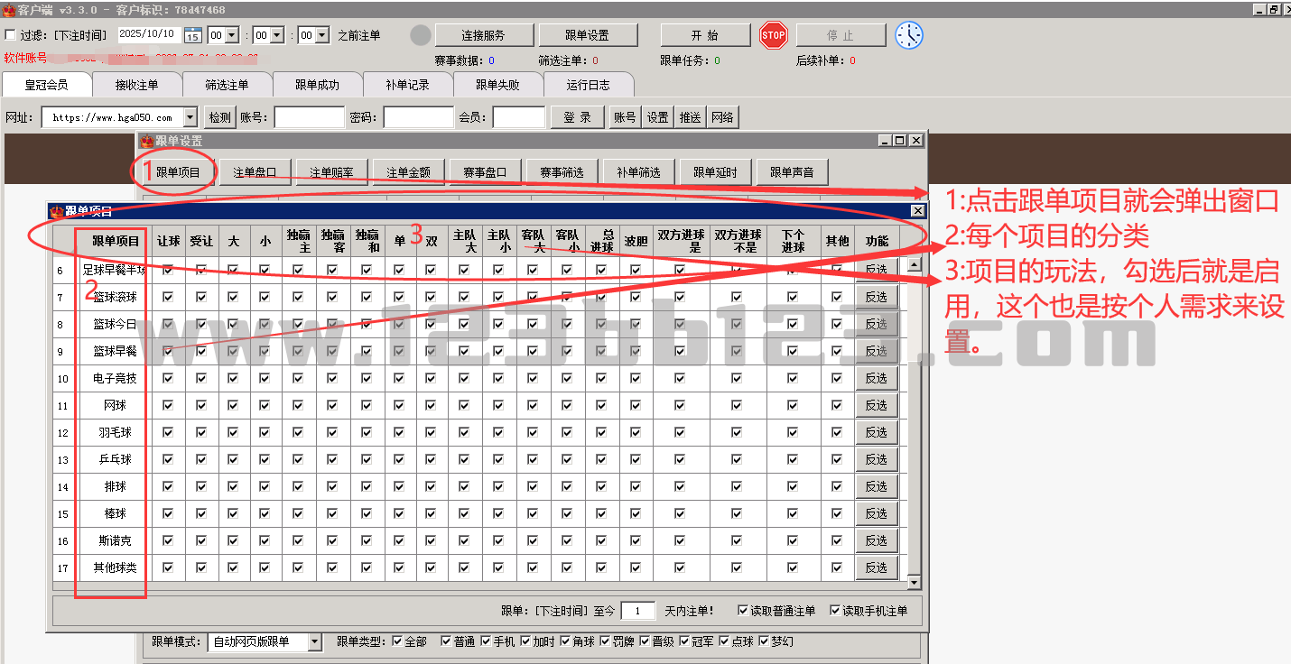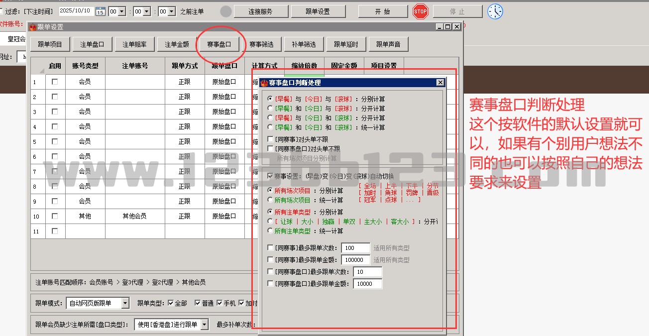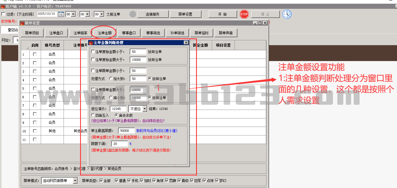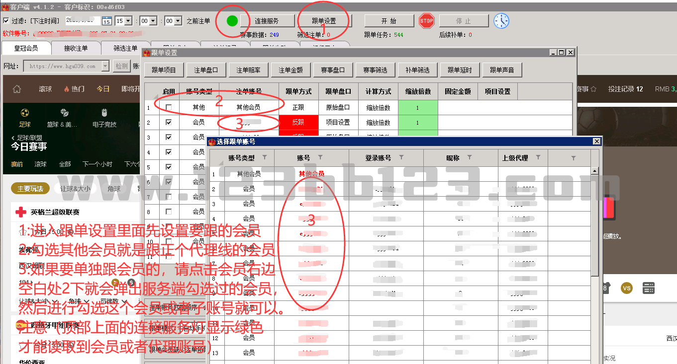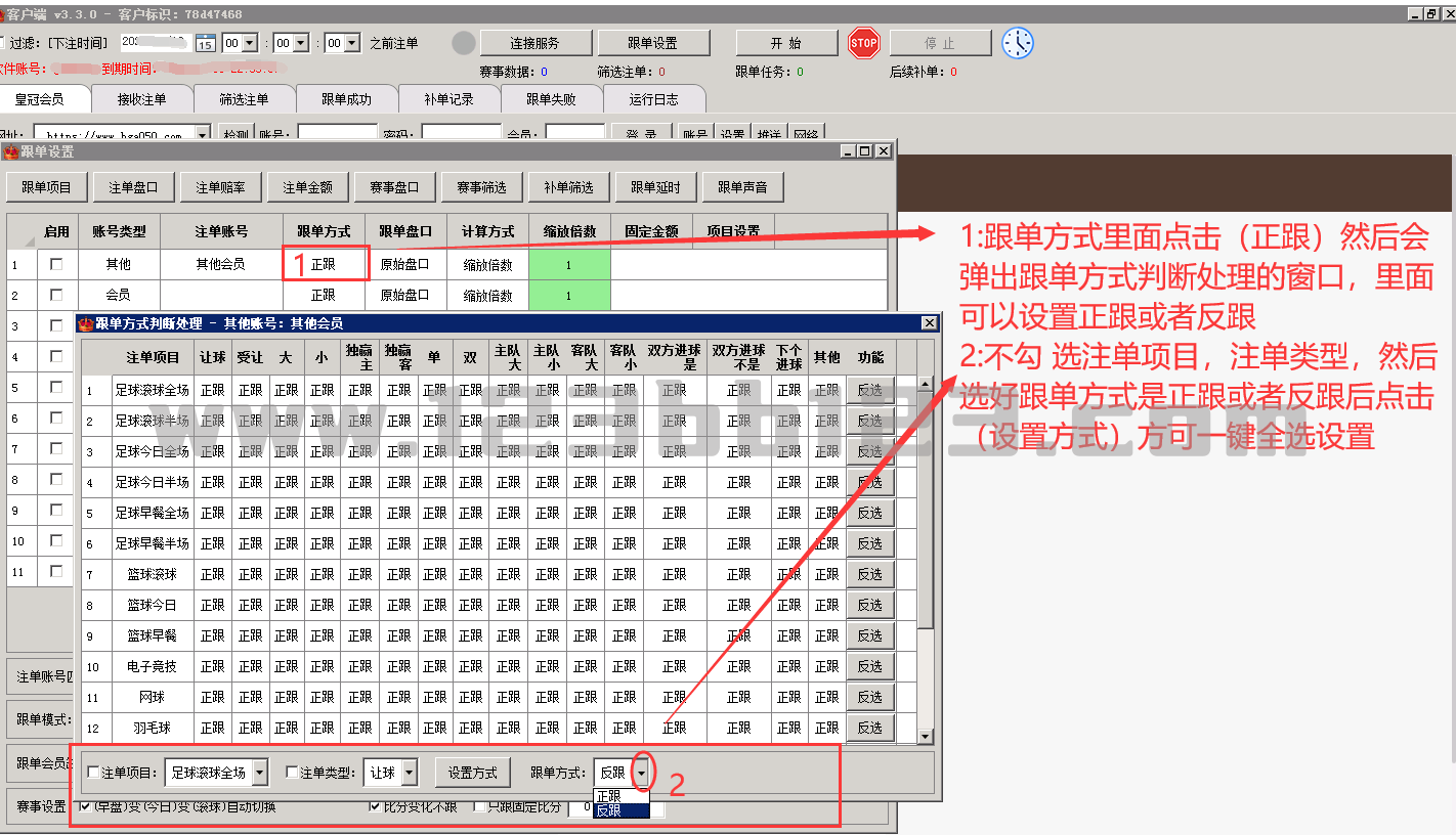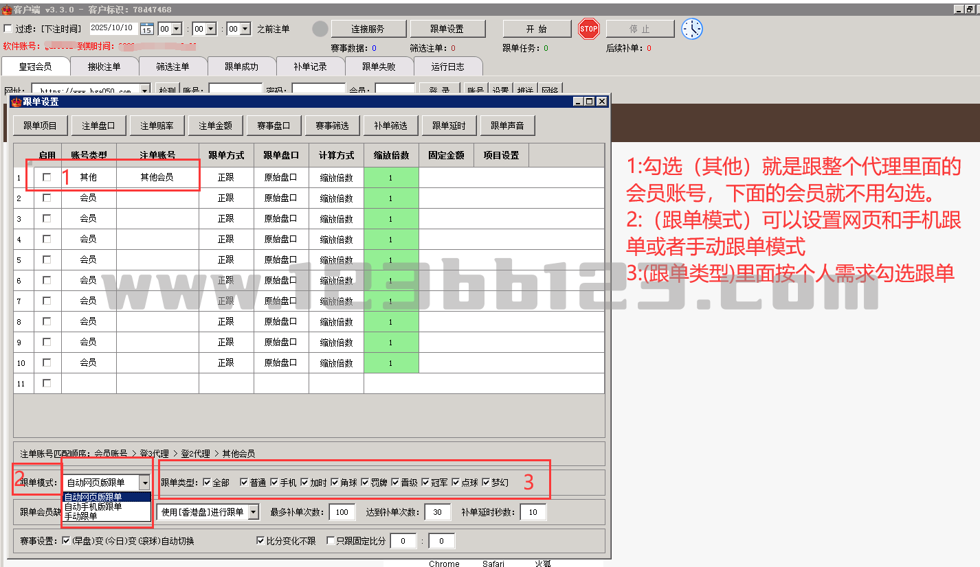 左边窗口是设置代理账号,右边窗口是单独跟的会员账号,如果要全跟整个代理线的就不用打开这个注单筛选窗口设置了。注意:必须要服务端账号登陆成功后才能读取账号。