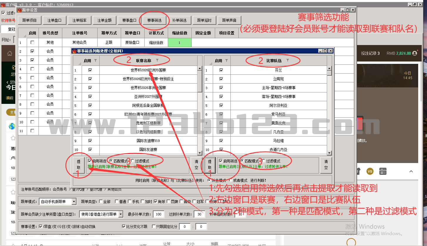 3:点击注单筛选也是弹出新窗口,首先勾选启用筛选,然后点击提取才能读取到账号。