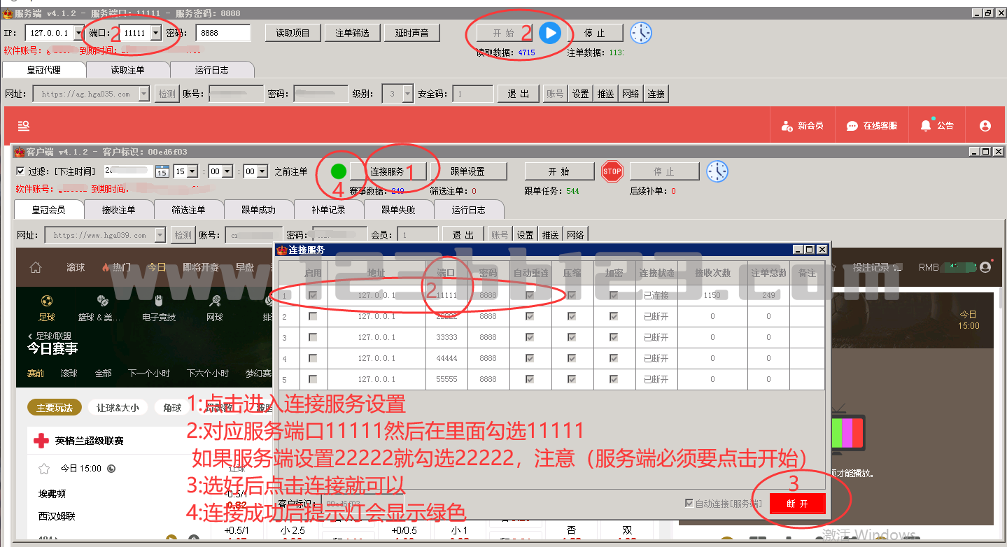 3:设置端口,首先点击连接服务会弹出新窗口。图片是分2张图的上面是服务端,下面是客户端,先看清楚服务端端口是11111,