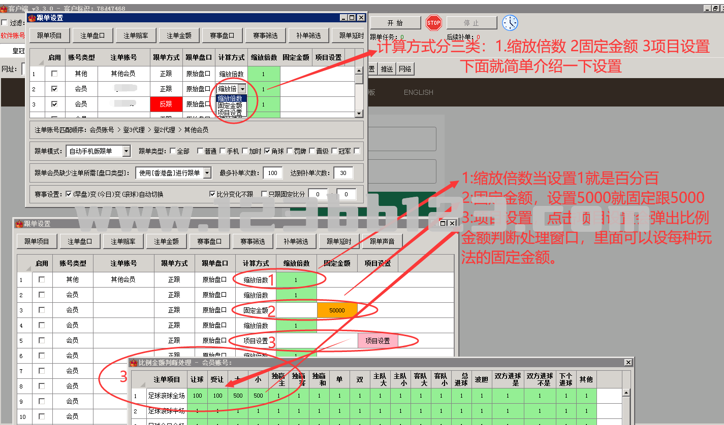 8:计算方式,计算方式是指下注金额的设置,软件分三类,1是按缩放比例,2是按固定金额,3是按项目设置。上面的图片也是有介绍设置。